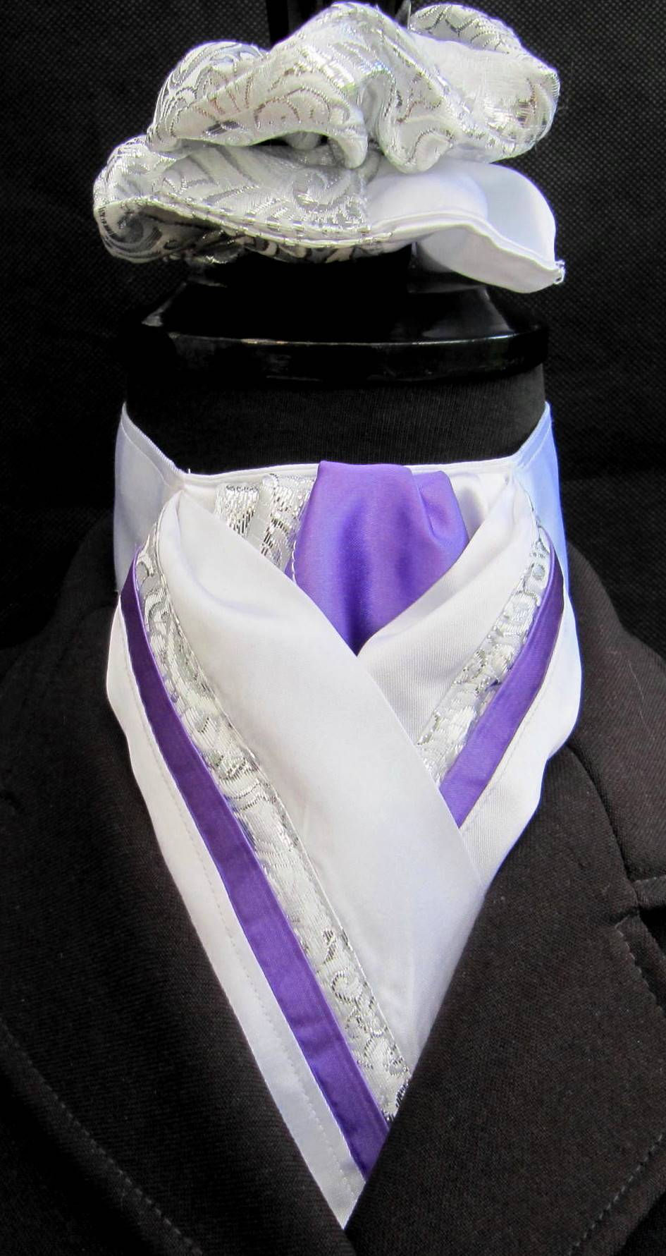 White Purple and Silver Paisley Faux Silk Riding Stock with option of Diamantes
